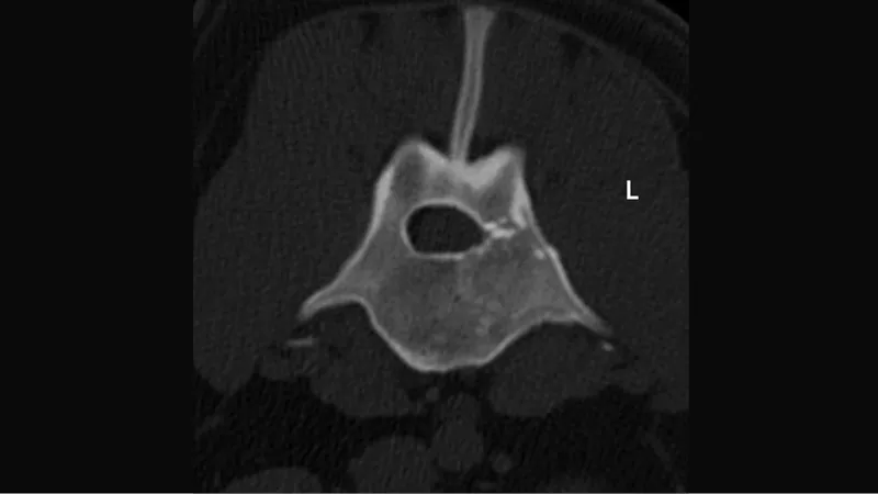 Figure 1: CT scan of the lumbar spine, showing a comminuted vertebral body and pedicle fracture of L3. Fracture fragments are visible within the spinal canal, compressing the spinal cord.